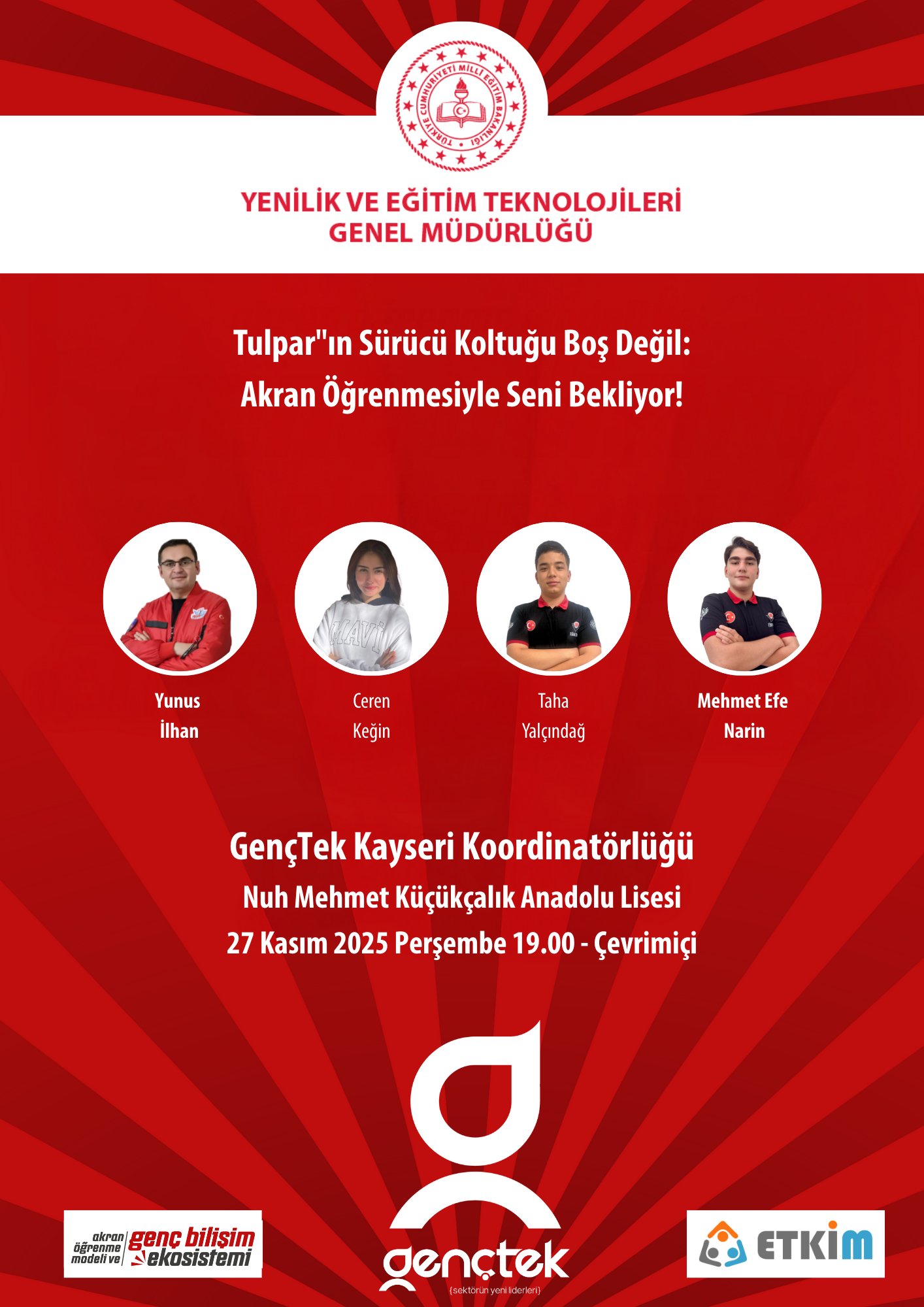 GençTek Akran Öğrenme Modeli ve Genç Bilişim Ekosistemi İl Programları, İzmir’den başlatıldı. Program kapsamında GençTek İzmir Koordinatörlüğü tarafından danışman öğretmenlere […]